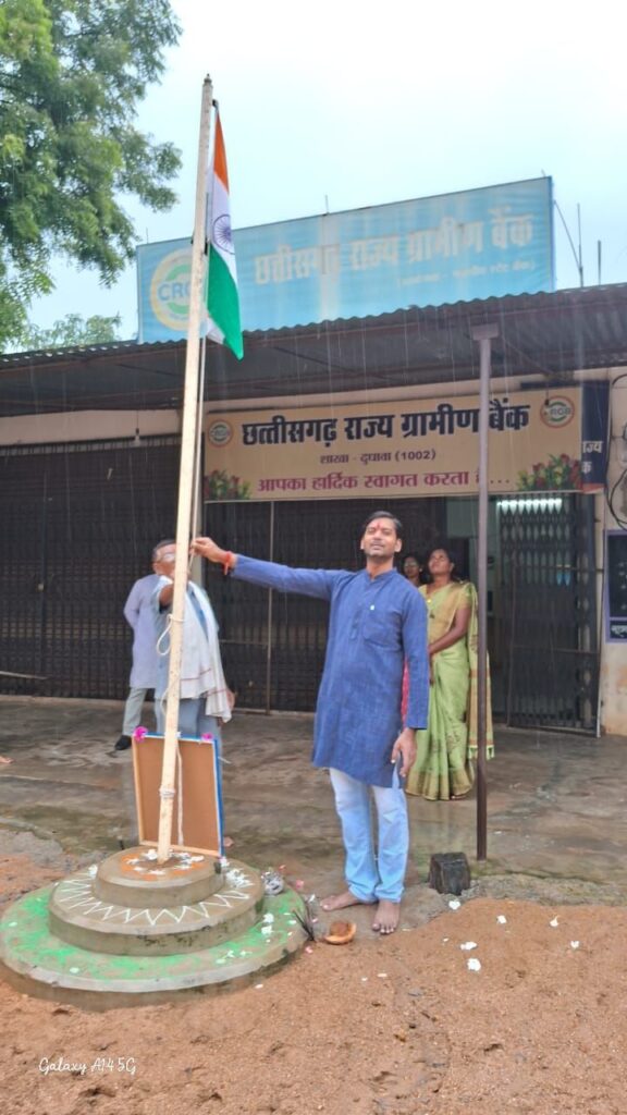 कांकेर -दुधावा- स्वतंत्रता दिवस के पावन अवसर पर छत्तीसगढ़ राज्य ग्रामीण बैंक शाखा दुधावा में देशभक्ति के उत्साह के बीच तिरंगा फहराया गया। शाखा प्रबंधक बुधेश्वर साहू ने राष्ट्रीय ध्वज फहराकर उपस्थित जनसमूह को एकता, समर्पण और देशसेवा का संदेश दिया।